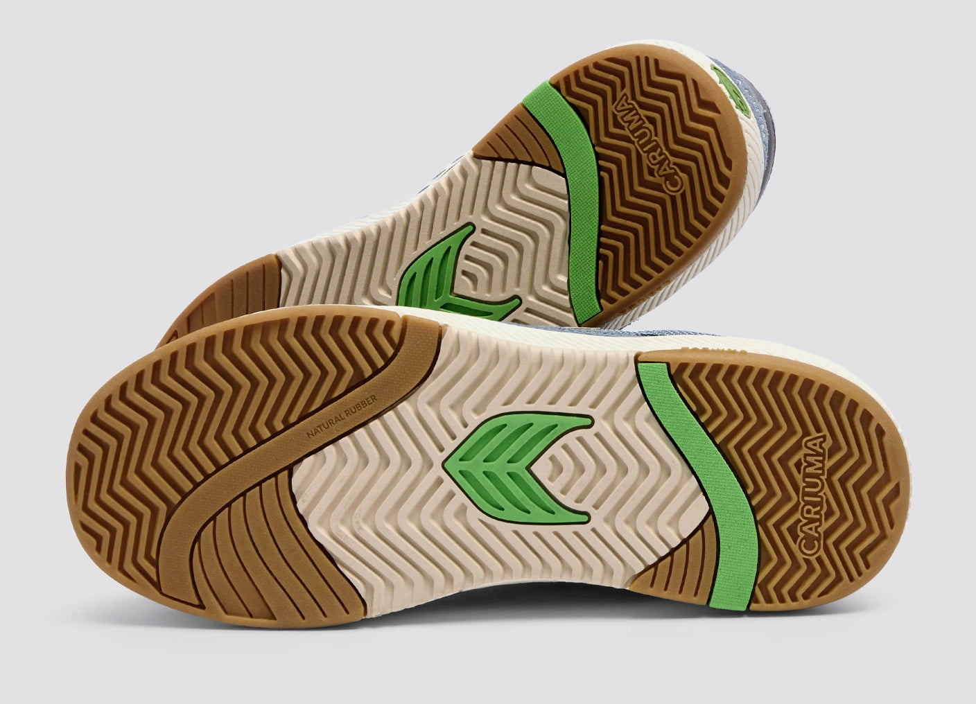 - Palmilha: Óleo de mamona, cortiça de base biológica e lona de algodão orgânico