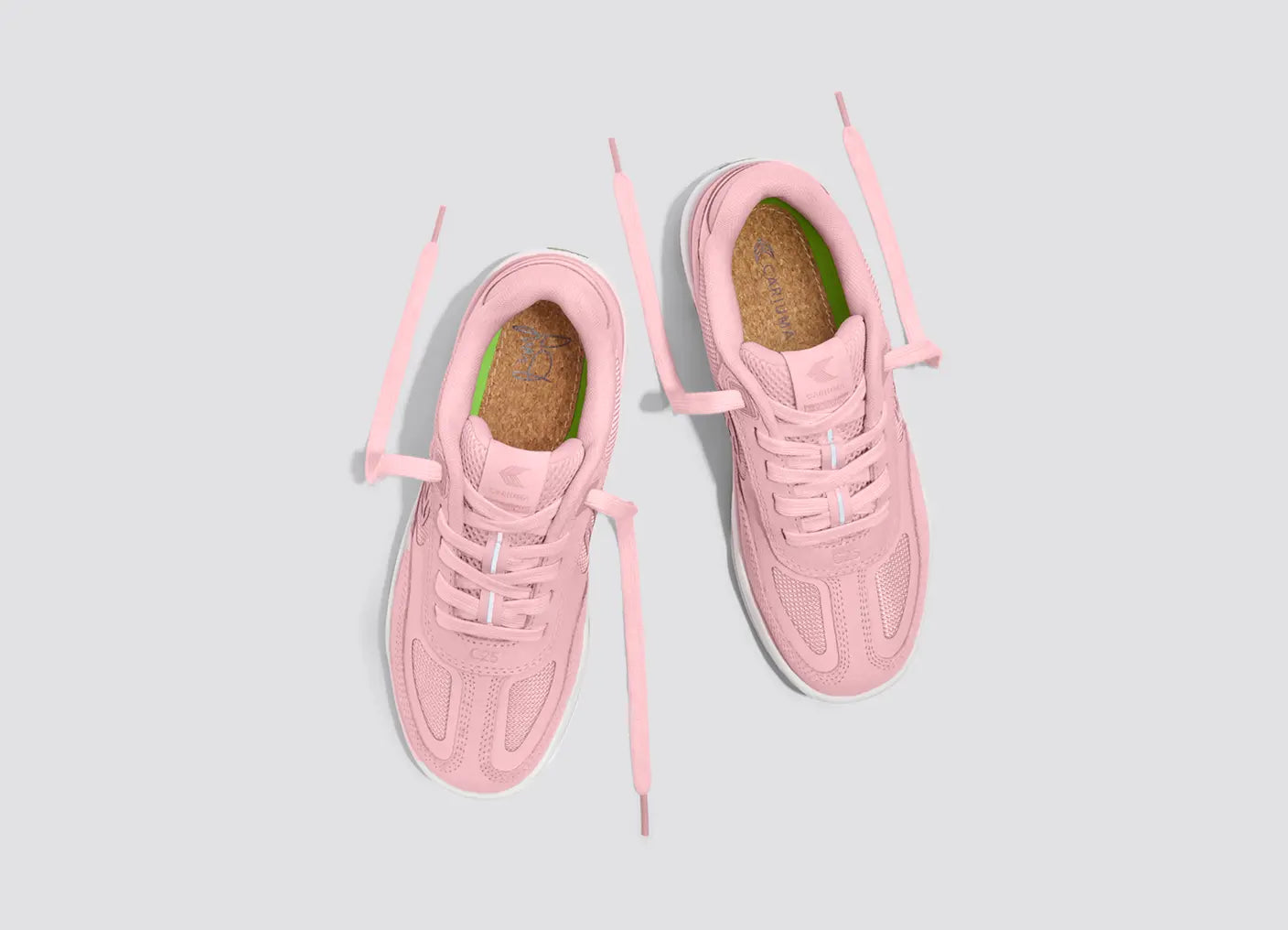 - Palmilha: Óleo de mamona, cortiça de base biológica e lona de algodão orgânico